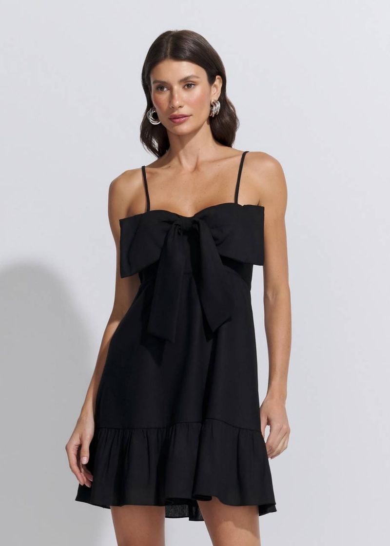 Romântico com um toque contemporâneo, o modelo em preto combina o babado na barra com o laço estruturado na frente, criando uma estética feminina e charmosa. As alças finas equilibram a silhueta e o zíper invisível nas costas garante o caimento impecável. Perfeito para jantares ou eventos noturnos, fica lindo com saltos delicados e acessórios dourados.