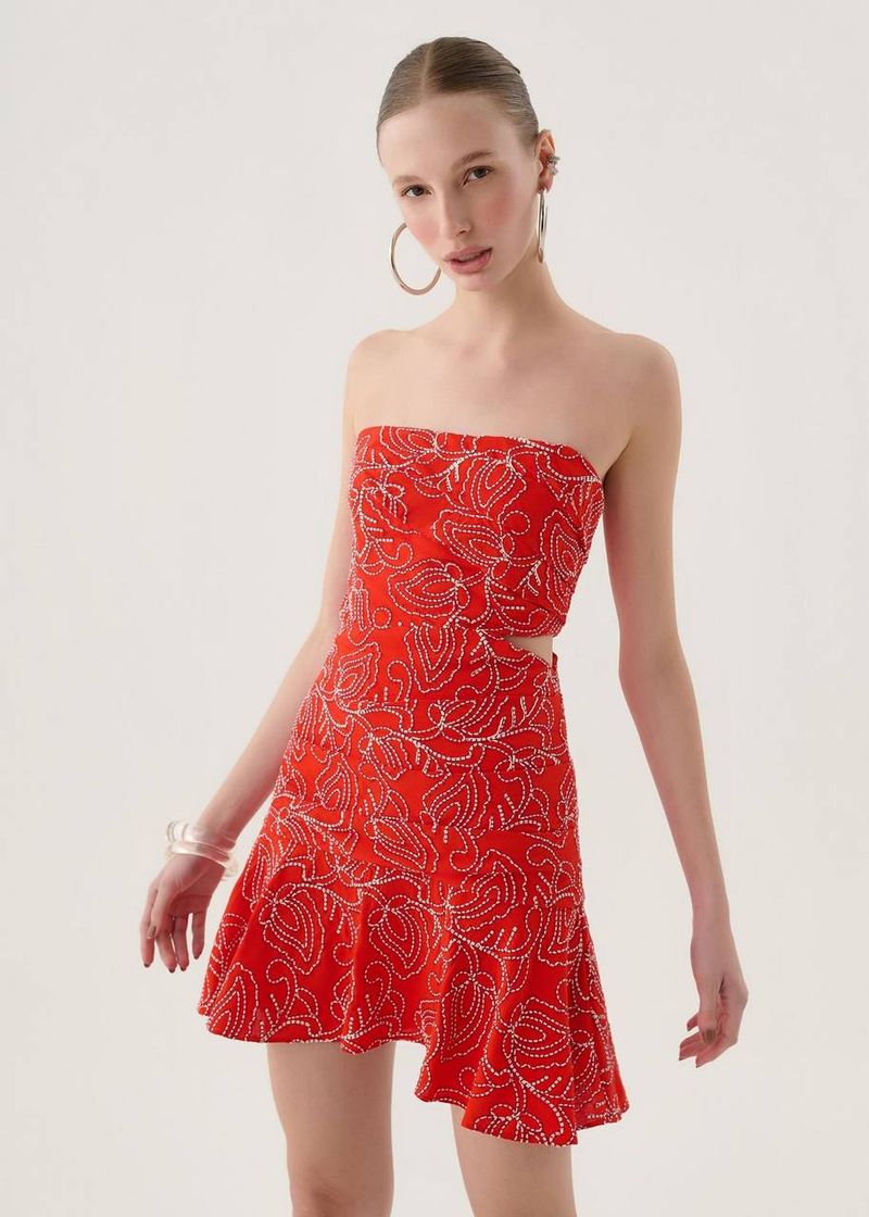 Vibrante e cheio de personalidade, o vestido curto bordado em vermelho é pura ousadia e estilo. O busto estruturado com barbatanas garante caimento impecável, enquanto os drapeados e babados da saia trazem fluidez ao visual. A abertura lateral é o toque de sensualidade que equilibra com a feminilidade da peça. Ideal para festas e ocasiões especiais, fica perfeito com acessórios dourados e salto alto.