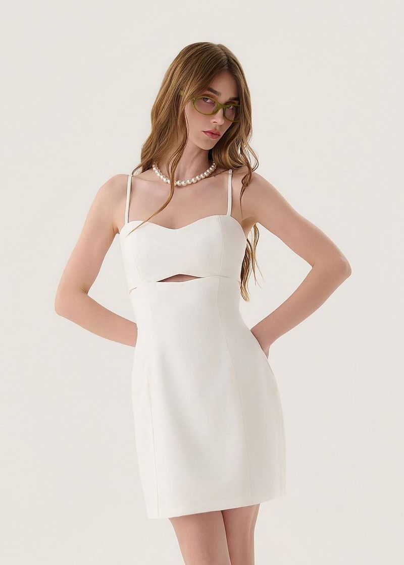 O vestido curto off white é a definição de sofisticação minimalista. O recorte na cintura confere um toque moderno e sensual, enquanto as alças finas trazem delicadeza ao design. O caimento estruturado valoriza a silhueta, com o conforto do elástico nas costas e a praticidade do zíper invisível. Ideal para produções refinadas, pode ser usado com sandálias metalizadas para um look de impacto.