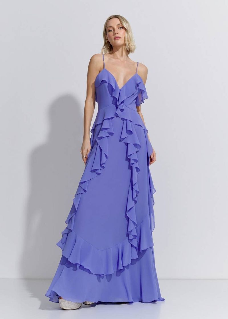 Com visual leve e toque romântico, o vestido longo lilás encanta pela delicadeza e fluidez do tecido, que cria movimento a cada passo. Os babados e o decote em V trazem feminilidade e sofisticação na medida certa, enquanto a cor lilás imprime frescor e elegância contemporânea. Use com sandálias douradas para um look elegante ou com rasteiras para uma proposta mais leve e charmosa. Um vestido que traduz a essência do verão com suavidade e presença.