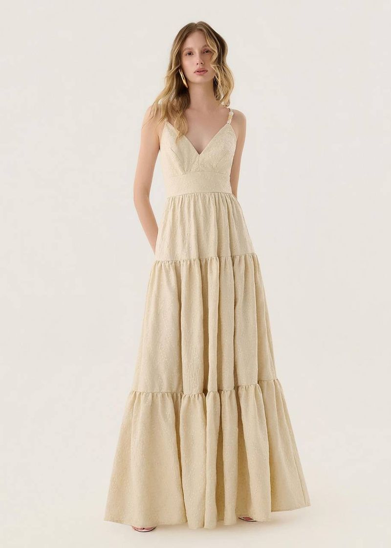 O vestido longo bordado na cor areia é a tradução da sofisticação natural. Os recortes no busto valorizam a silhueta, enquanto os franzidos da saia trazem fluidez e movimento delicado. As alças com três passantes em cada detalhe reforçam o design exclusivo, tornando-o perfeito para ocasiões ao ar livre com um toque de elegância.