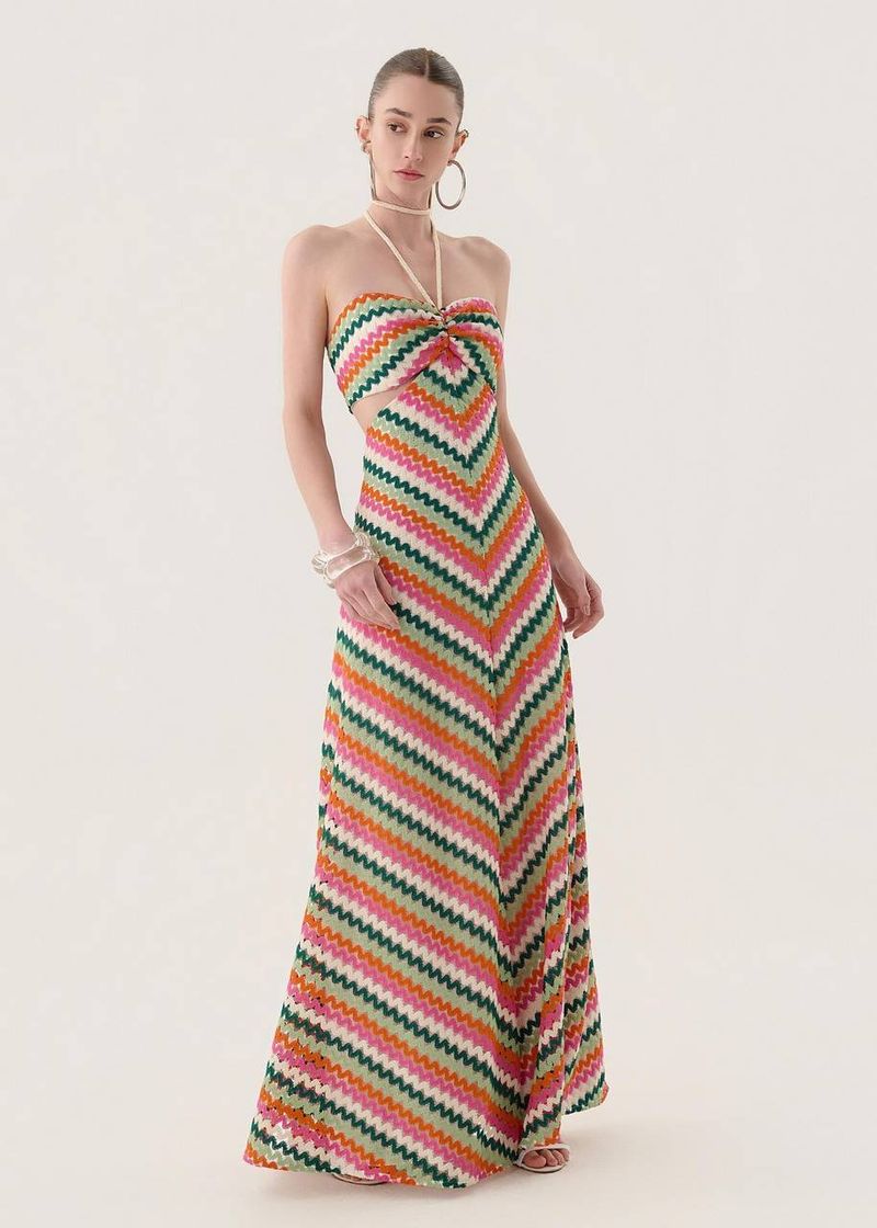 Vestido longo bordado, com aberturas laterais e busto franzido com cordão para amarração no pescoço. As costas possuem detalhe de top com amarração, trazendo leveza e sensualidade ao design. A saia fluida conta com zíper invisível centralizado no meio das costas, garantindo acabamento sofisticado.