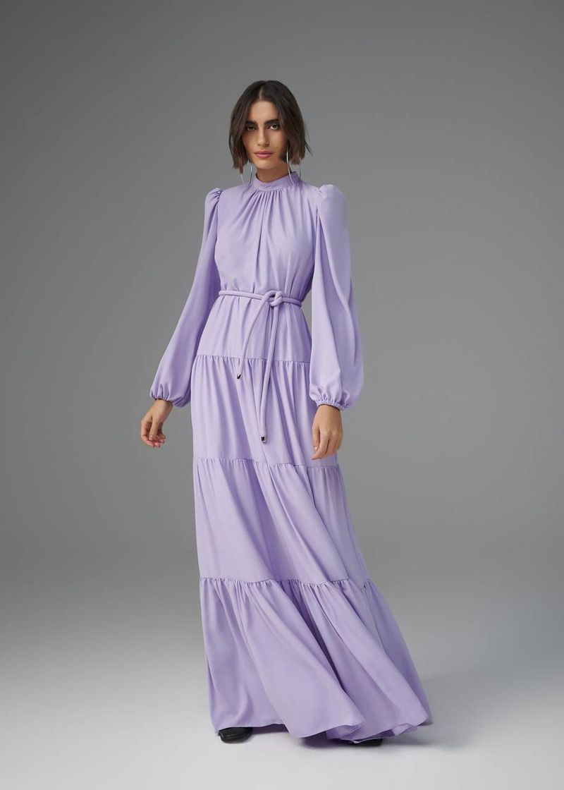Combinando elegância e modernidade, este vestido longo apresenta um caimento fluido e elementos estruturados que enriquecem o visual. As mangas bufantes conferem volume e romantismo, enquanto os recortes franzidos adicionam leveza e movimento à peça. O fechamento por botões na gola proporciona um detalhe clássico e requintado. O cordão ajustável na cintura oferece versatilidade na modelagem, permitindo um ajuste sofisticado e confortável. Na tonalidade violace, o vestido se destaca pelo toque contemporâneo e expressivo, perfeito para composições sofisticadas e cheias de personalidade.
