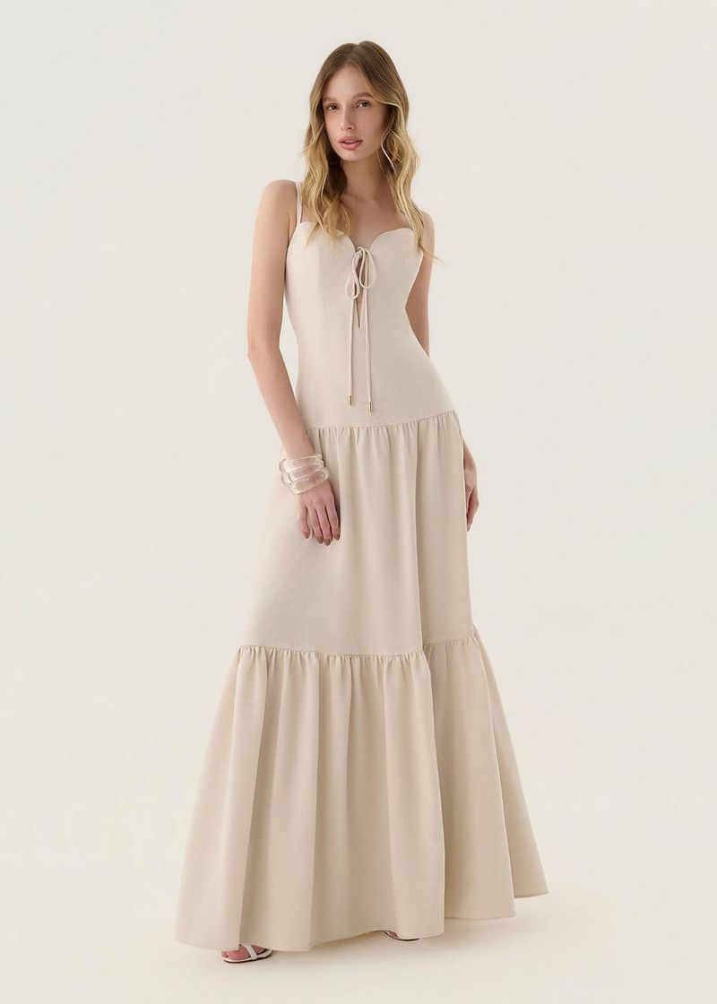 O vestido longo areia é uma peça sofisticada que valoriza a silhueta com seu busto estruturado em armação de metal e barbatanas embutidas. A saia em camadas horizontais com franzidos traz movimento elegante e um ar romântico. O detalhe do elástico nas costas garante conforto sem abrir mão do caimento impecável. Perfeito para ocasiões especiais, pode ser usado com sandálias delicadas e acessórios dourados para realçar o tom neutro.