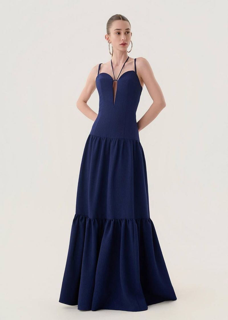 O vestido longo marinho transmite impacto e sofisticação, com busto estruturado e detalhes de franzidos que equilibram modernidade e feminilidade. O contraste do tom profundo com os recortes valorizadores da peça faz dele uma escolha perfeita para eventos noturnos. Combine com acessórios prata ou pedrarias escuras para intensificar o ar glamuroso.