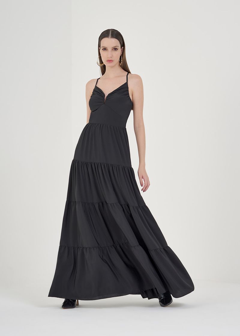 Se jogue na elegância atemporal com este vestido longo em crepe. Com suas alças delicadas e um decote em V estruturado, este vestido destaca-se pelos recortes franzidos que proporcionam um toque sofisticado. O zíper invisível nas costas assegura um fechamento discreto e elegante. Este vestido é uma escolha refinada para eventos especiais, oferecendo um visual clássico e ao mesmo tempo moderno.