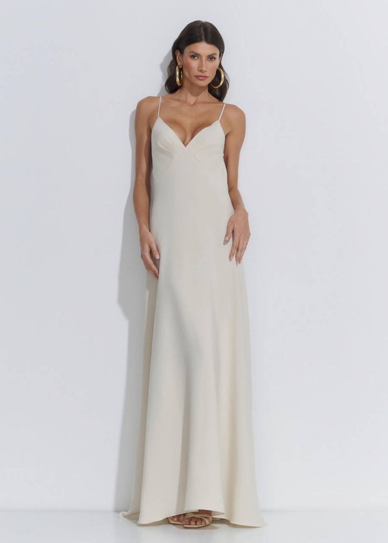 O vestido longo em tom aveia é a tradução da sofisticação minimalista. O drapeado no busto cria delicadeza na medida certa, enquanto a amarração nas costas garante frescor e ajuste perfeito. Sua tonalidade neutra abre espaço para combinações elegantes com sandálias metálicas ou acessórios em pedras naturais. Ideal para casamentos ao ar livre, jantares sofisticados ou eventos em que a sutileza é sinônimo de impacto.