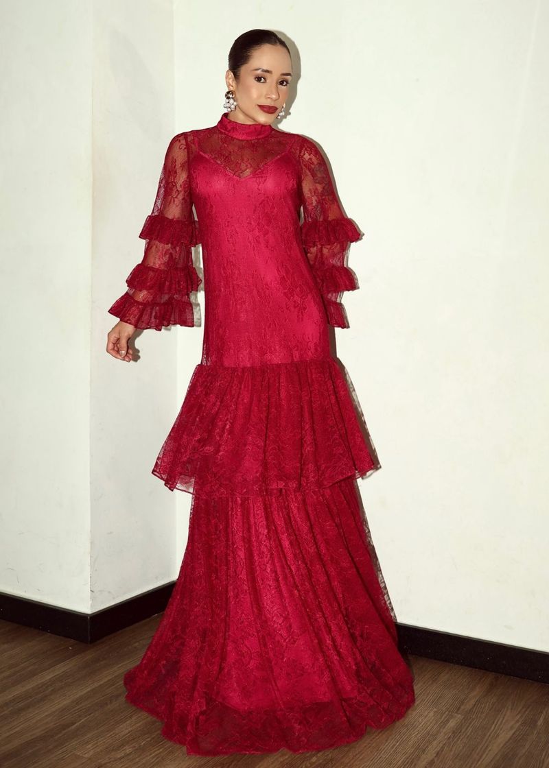 Vestido Longo De Renda Com Babados - Bordo