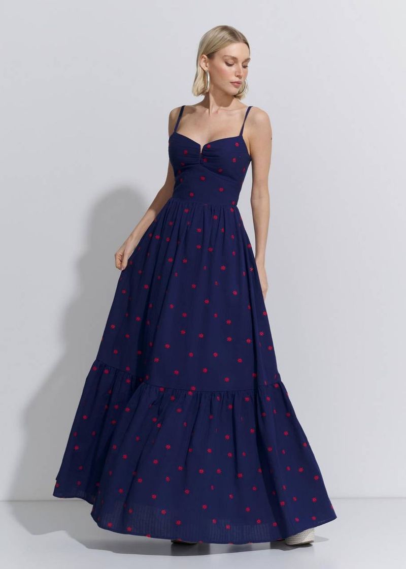 Sofisticado e marcante, o vestido longo na cor marinho tem presença. O decote estruturado com armação de metal valoriza o busto com segurança, enquanto o detalhe de elástico nas costas proporciona conforto ao vestir. As alças e o zíper discreto garantem um visual elegante e contemporâneo. Use com saltos altos e acessórios prateados para um look noturno com impacto e classe.