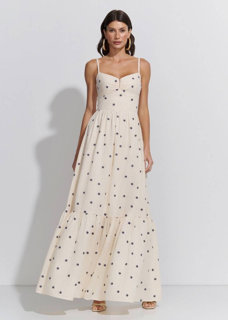 A leveza do tom natural se une ao charme delicado da estampa para criar um vestido longo encantador. Com alças finas e estrutura em metal no decote, valoriza o colo com elegância. O caimento fluido alonga a silhueta e traz sofisticação à peça, enquanto o elástico nas costas garante ajuste e conforto. Ideal para eventos diurnos e festas à beira-mar. Combine com sandálias neutras ou douradas para um visual solar e chic.