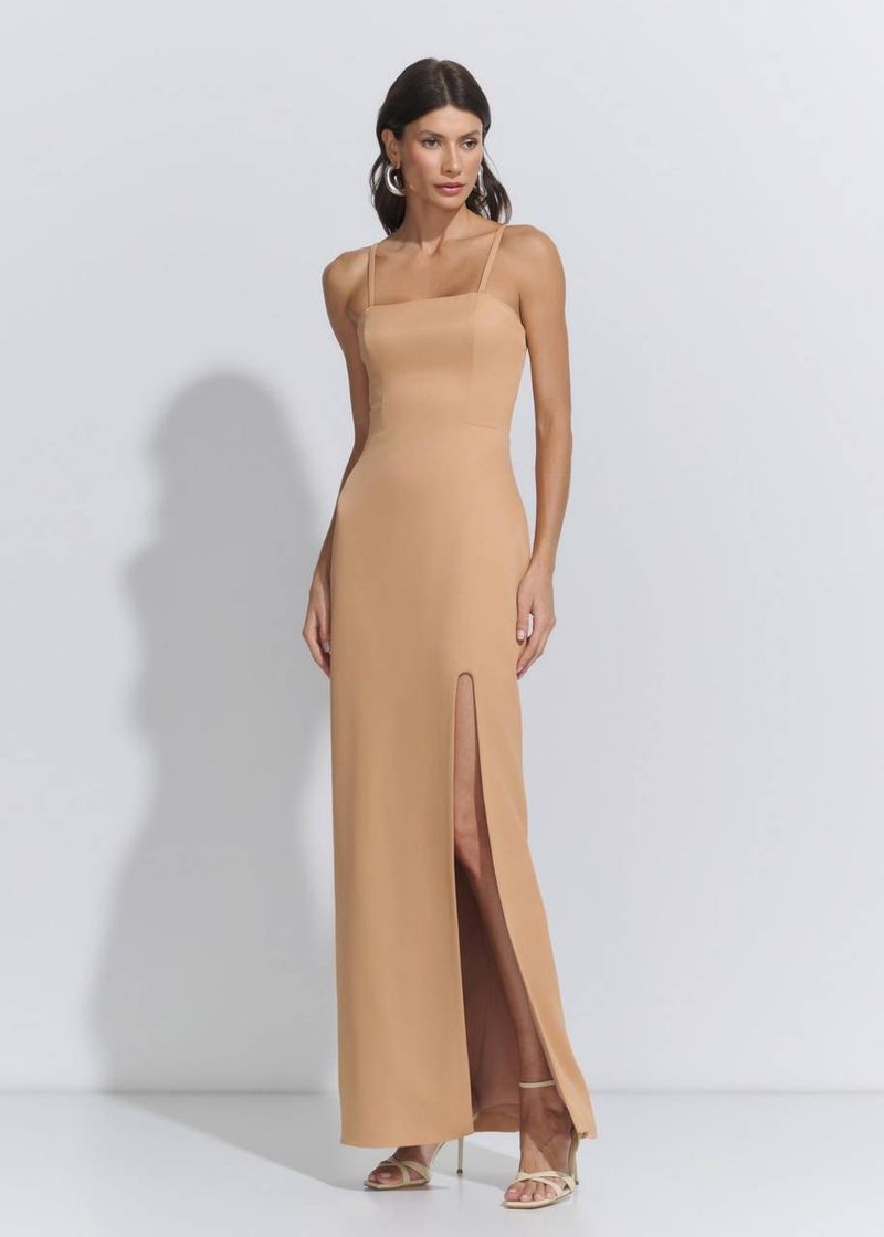 Vestido Longo Fenda Crepe Patou - Camel
