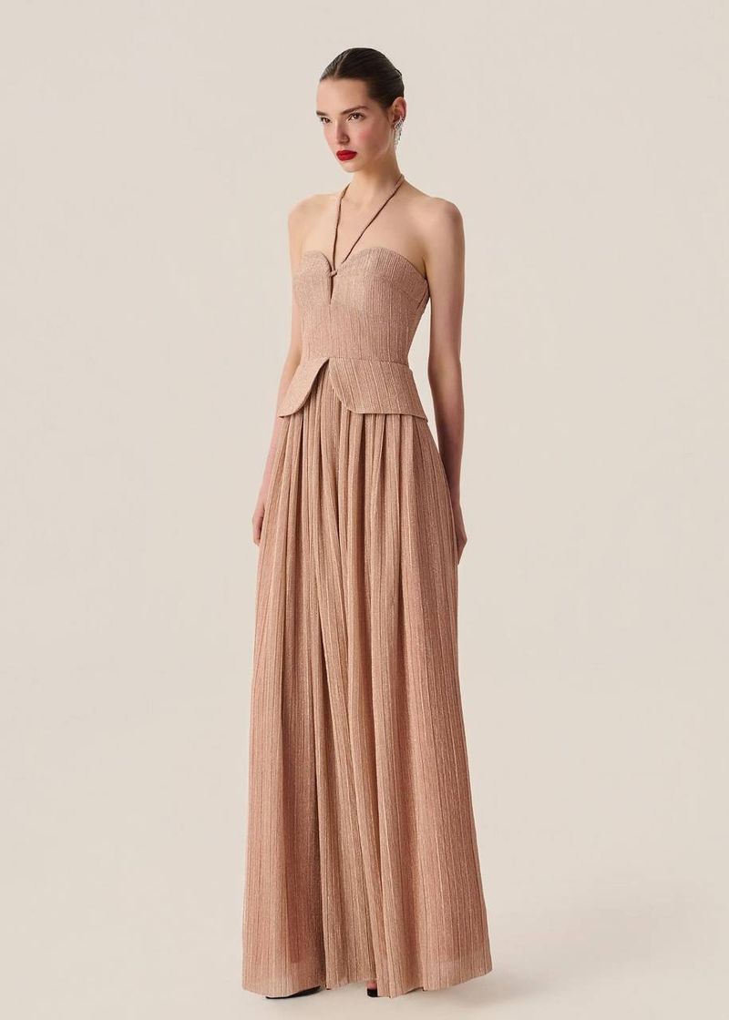 Na versão rose, o vestido longo plissado em lurex ganha delicadeza romântica com brilho sutil. O busto estruturado com armação de metal valoriza o colo, enquanto o peplum traz sofisticação contemporânea. A saia plissada confere leveza e movimento refinado, ideal para ocasiões especiais que pedem impacto visual. Aposte em joias minimalistas e salto nude para compor um look feminino e sofisticado.