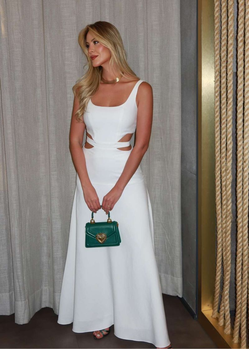 O off-white eleva o vestido a uma proposta atemporal e chic, perfeito para ocasiões especiais como batizados, jantares ou até looks de noiva moderna. Os recortes trazem sensualidade discreta, equilibrada pela fluidez da saia. Combine com sandálias de salto fino e clutch minimalista para um visual sofisticado e marcante.
