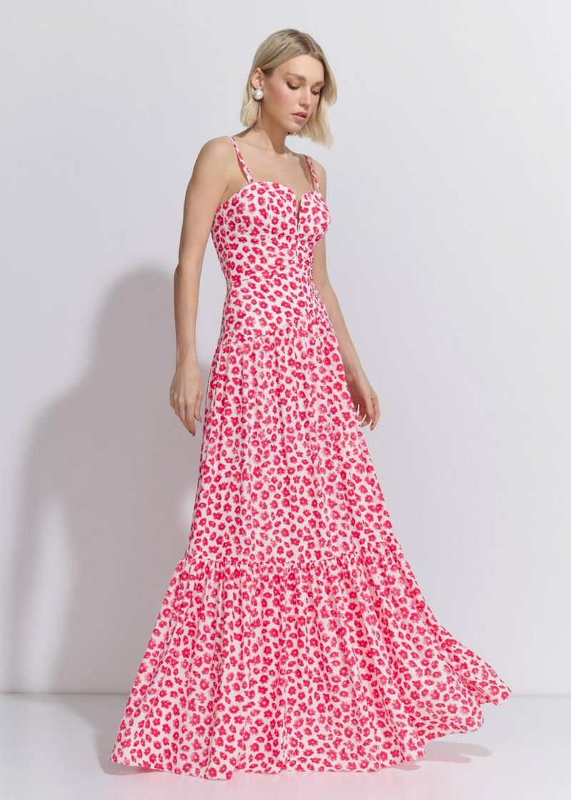 Combinando romantismo e sofisticação, este vestido longo em crepe de estampa exclusiva é perfeito para ocasiões especiais à luz do dia ou eventos noturnos. O decote com armação valoriza o busto de forma elegante, enquanto os recortes estratégicos e franzidos trazem leveza e movimento à peça. As alças delicadas realçam os ombros e as costas contam com fechamento em zíper invisível para um acabamento impecável. Um modelo que une charme e frescor em cada detalhe.