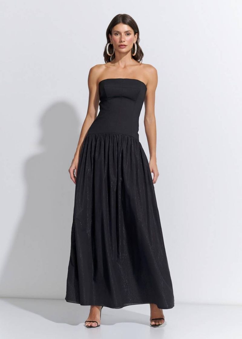 "O vestido longo preto com saia fluida é puro glamour minimalista. A estrutura do corpo com barbatanas garante um caimento impecável, destacando a silhueta com elegância. A fenda sutil e o volume leve da saia criam um visual poderoso e sofisticado. Use com salto fino e acessórios dourados para um look noturno irresistível. Essencial no closet de quem valoriza peças marcantes e versáteis.
