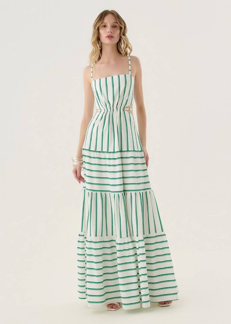 Na versão off white, o vestido longo listrado ganha leveza e um toque de sofisticação minimalista. O franzido na cintura cria delicadeza, e o detalhe vazado equilibra modernidade com feminilidade. O caimento fluido da saia amplia o movimento, tornando-o perfeito para ocasiões diurnas ou encontros casuais chic. Aposte em rasteiras elegantes ou saltos claros para manter a suavidade do look.