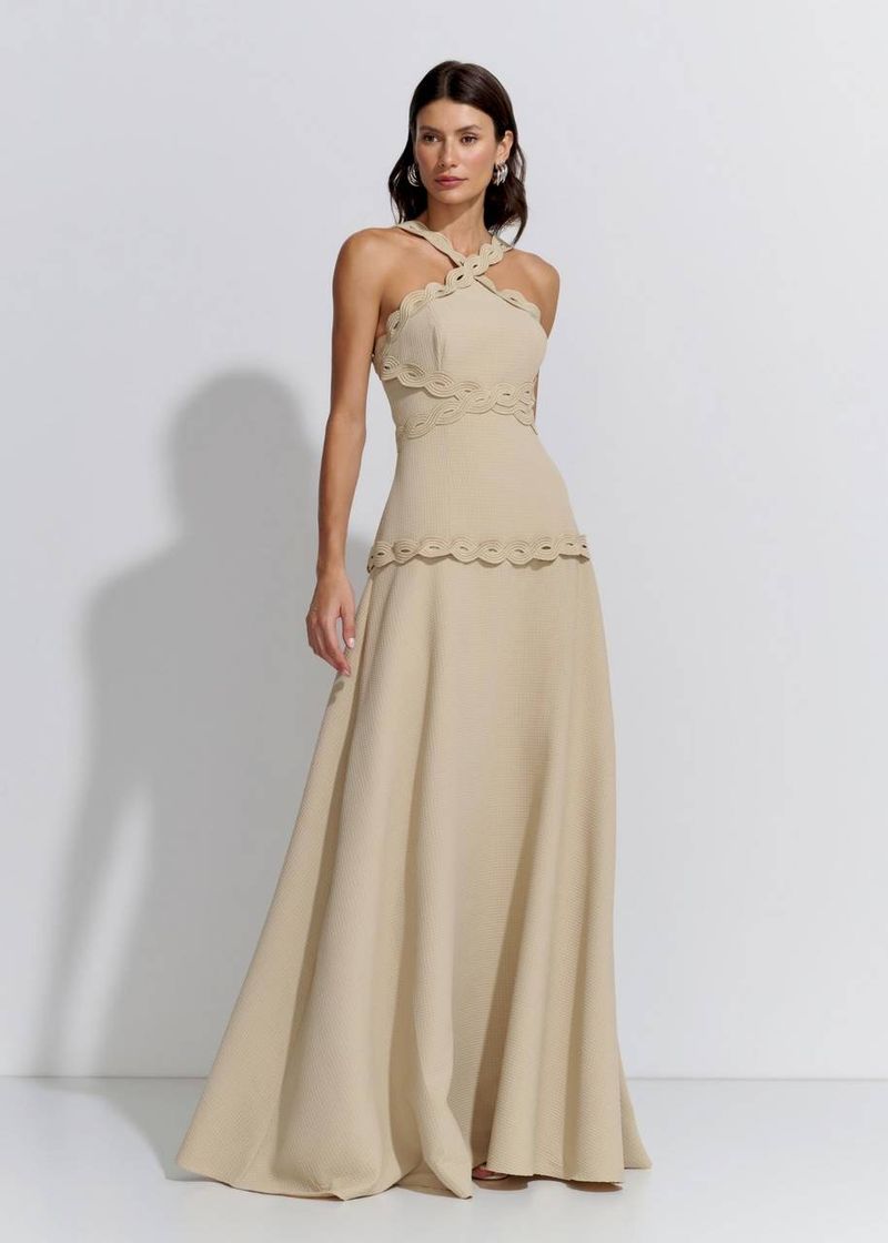 Com um visual que evoca sofisticação à primeira vista, o vestido longo areia é a escolha perfeita para ocasiões especiais. O tecido com textura valoriza os recortes estratégicos e o aviamento aplicado no corpo e nas alças cria um efeito marcante. O zíper invisível nas costas garante um caimento impecável e elegante. Aposte em sandálias metalizadas e acessórios minimalistas para um look de presença atemporal.