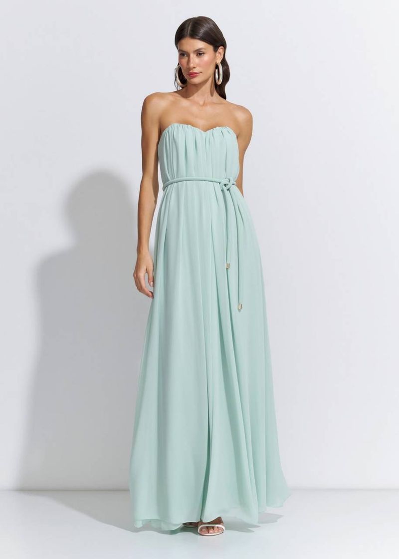 A tonalidade acqua traz frescor e sofisticação ao vestido longo com caimento fluido. O decote estruturado com suporte interno valoriza o colo com elegância, enquanto o cinto do mesmo tecido destaca a cintura com suavidade. Ideal para festas ao pôr do sol ou casamentos à beira-mar. Use com sandálias metalizadas e brincos alongados para um look leve e encantador.