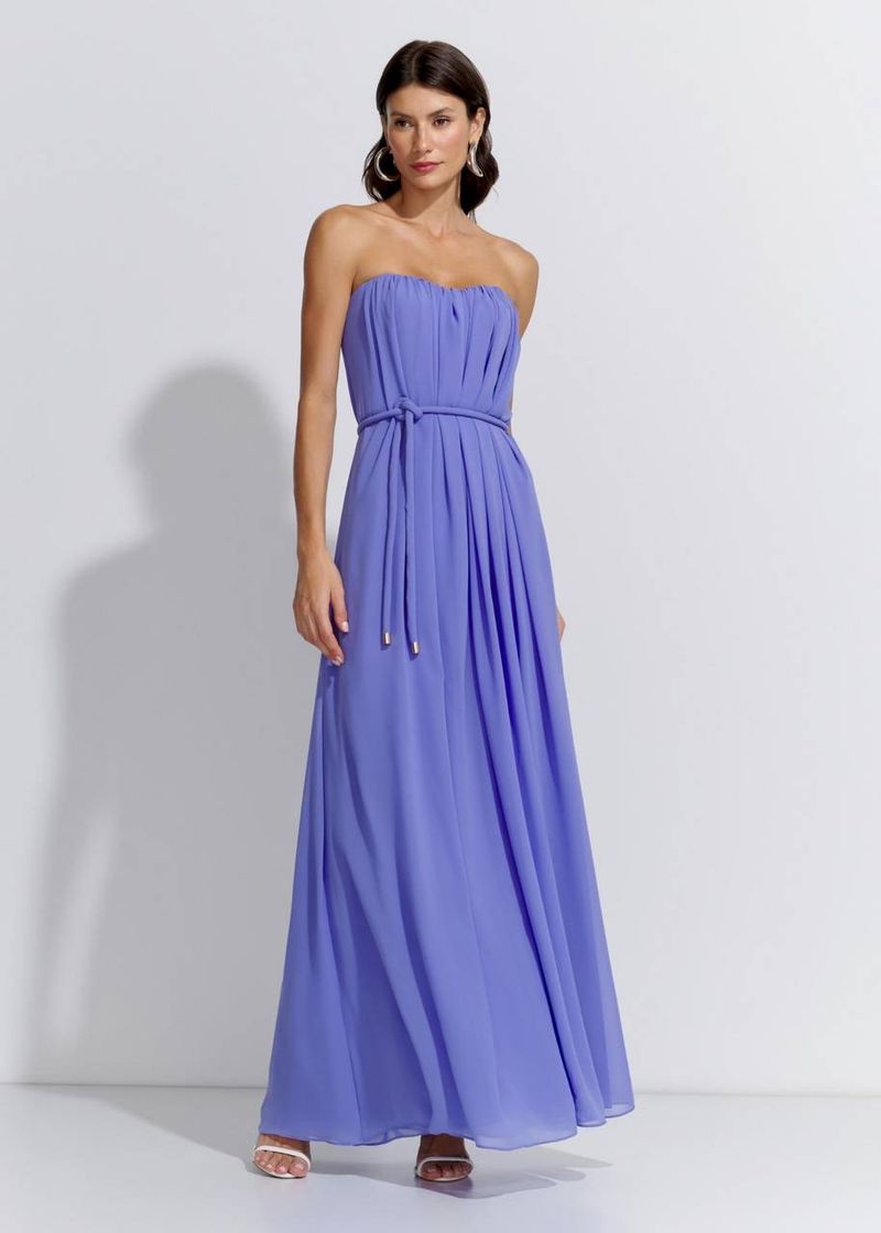 A delicadeza do lilás se une à sofisticação neste vestido tomara que caia de caimento leve e elegante. O busto estruturado e o cinto do mesmo tecido realçam a silhueta, trazendo equilíbrio entre romantismo e modernidade. Perfeito para eventos formais, festas ao pôr do sol ou jantares especiais, o modelo ganha ainda mais charme quando combinado a acessórios dourados e penteados presos, revelando uma beleza feminina e atemporal.
