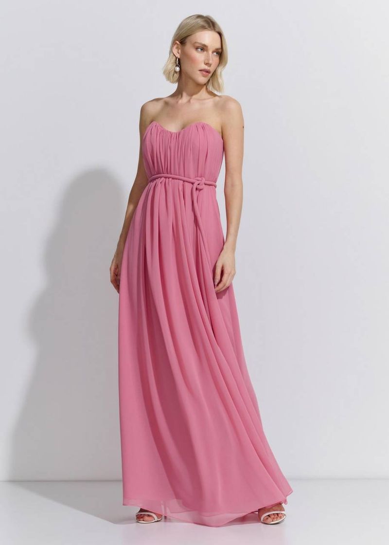 A feminilidade do lilás ganha vida nesta peça fluida, perfeita para celebrações românticas e elegantes. A modelagem valoriza a silhueta com o busto estruturado e o cinto do mesmo tecido, realçando a cintura. Ideal para eventos formais ou jantares ao ar livre, fica lindo com acessórios dourados e penteados presos.