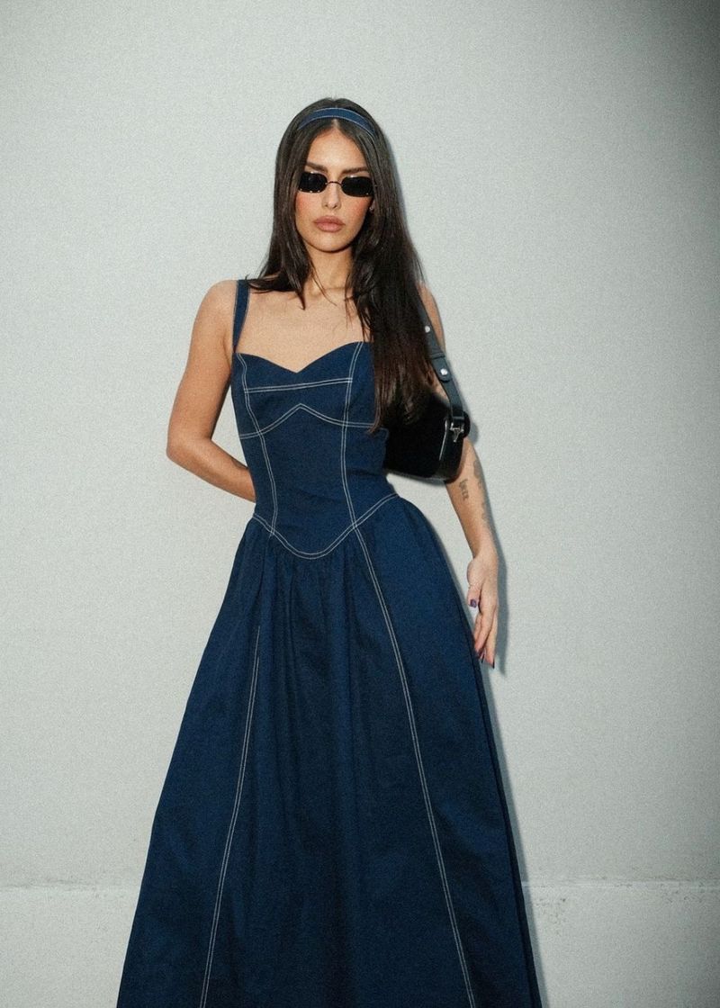 O tom marinho realça o toque clássico e elegante deste vestido com corset estruturado. A saia mídi com franzido na cintura garante fluidez e movimento ao caminhar, enquanto os recortes estratégicos valorizam a silhueta. O elástico nas costas e o zíper invisível centralizado oferecem conforto e acabamento refinado. Use com sandálias de tiras e brincos statement para ocasiões especiais com um toque de sofisticação navy.