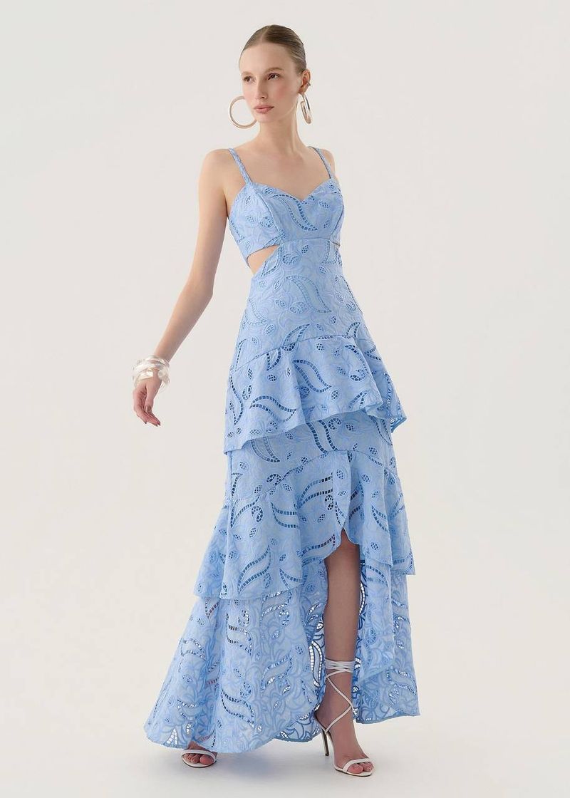 O vestido midi bordado em azul traduz modernidade e frescor em uma peça sofisticada. O busto estruturado com pregas e barbatanas embutidas garante sustentação e caimento impecável, enquanto o jabô lateral acrescenta movimento elegante. A fenda na lateral direita adiciona ousadia sutil, ideal para eventos noturnos ou ocasiões especiais. O zíper invisível nas costas completa o acabamento refinado.