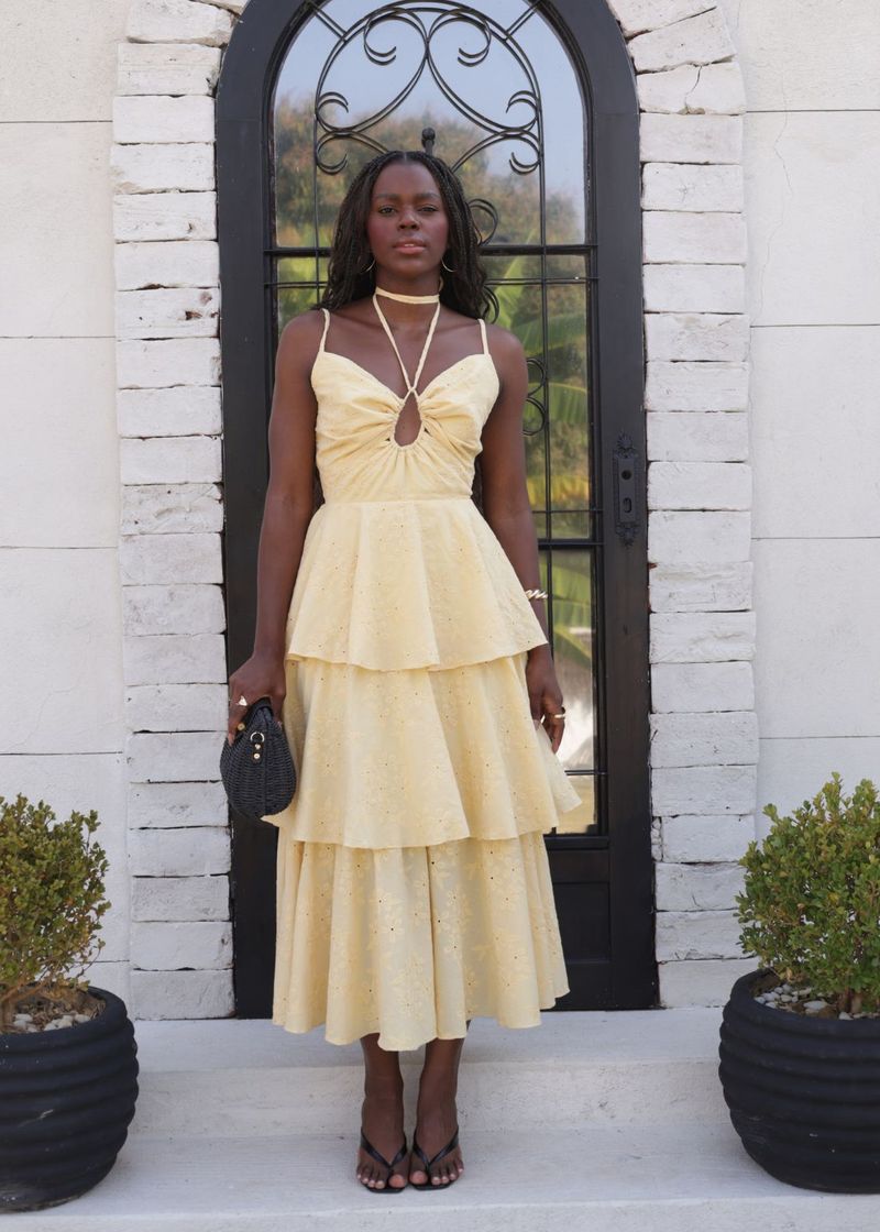 Suave e elegante, o tom manteiga valoriza ainda mais a fluidez dos babados em camadas, criando um visual leve e atemporal. O busto ajustado com rolotê e ponteiras metálicas proporciona charme e estrutura, enquanto o comprimento midi garante versatilidade para diversas ocasiões. Use com salto nude ou rasteira metalizada e finalize com uma bolsa pequena para compor um look fresh e feminino.