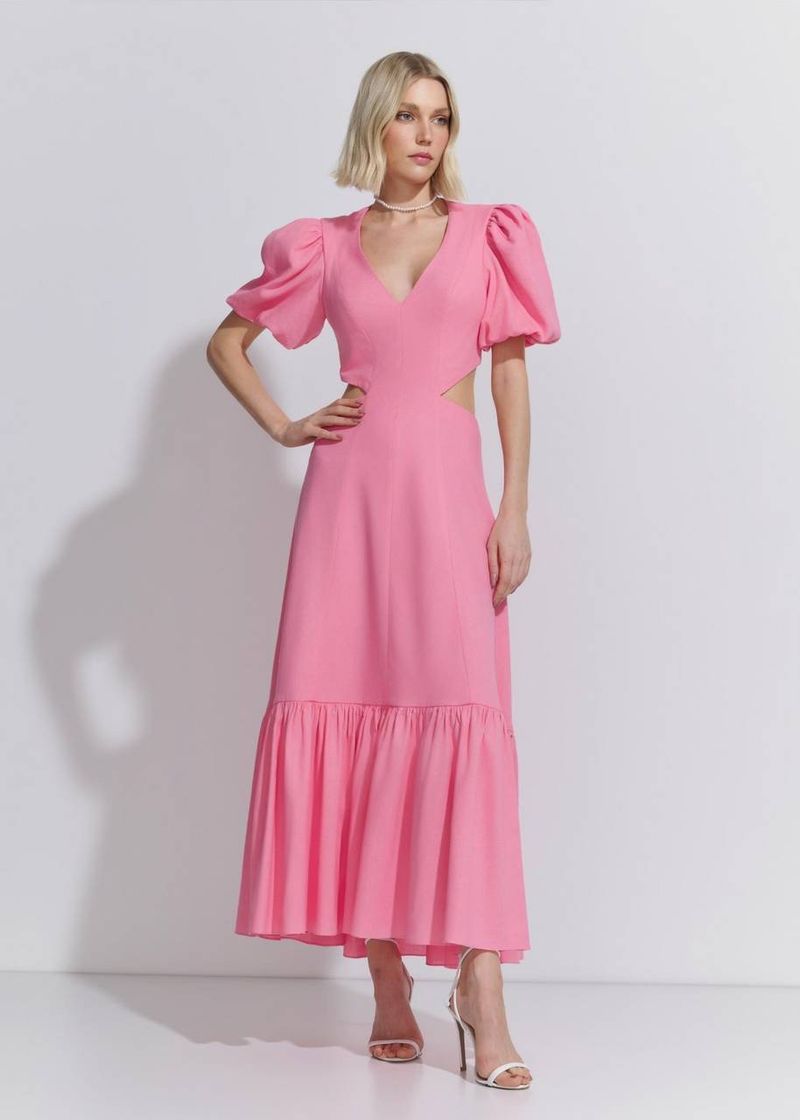 Com um tom vibrante e feminino, o rosa traz ainda mais charme ao vestido maxi mídi com mangas bufantes. Os recortes estratégicos e o vazado na cintura valorizam a silhueta com elegância e modernidade. A saia com babados adiciona movimento e um toque romântico à produção. Ideal para ocasiões especiais ou eventos ao ar livre, ele combina perfeitamente com sandálias de tiras ou salto bloco. Para um look completo, aposte em acessórios dourados e uma clutch estruturada.