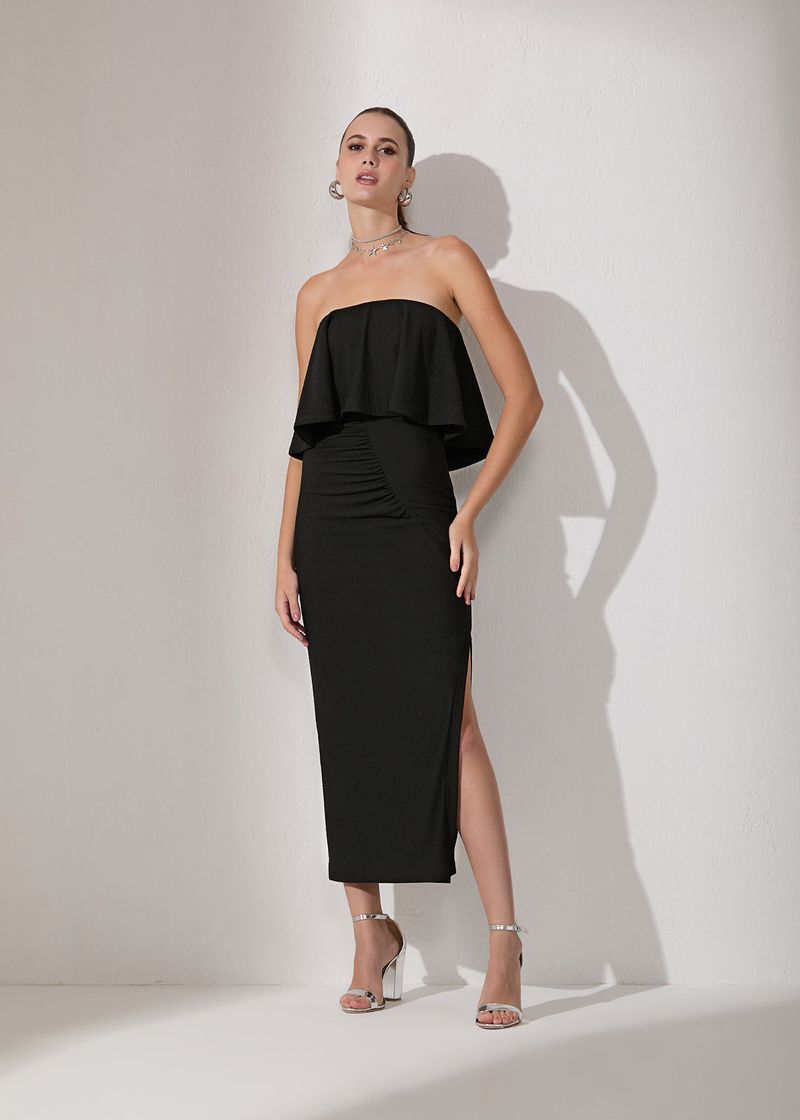 Vestido em malha texturizada, com comprimento midi e modelagem strapless. Seu detalhe de sobreposição no busto adiciona elegância ao design, enquanto o franzido no corpo proporciona um caimento fluido, destacando suavemente a silhueta. Na cor preta, este Vestido Maxi Midi é ideal para ocasiões que remetem à sofisticação sem perder o conforto. Uma peça perfeita para composições formais e cheias de estilo. Experimente essa opção elegante e versátil em seu guarda-roupa!