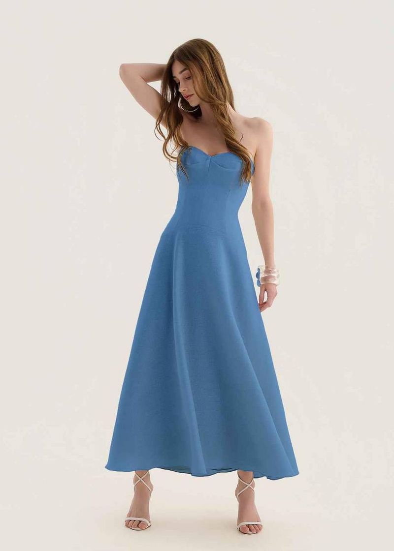 O vestido midi em azul é um charme atemporal. O busto com pregas adiciona delicadeza, enquanto os recortes na cintura com barbatanas embutidas realçam a silhueta de forma elegante. As costas contam com elástico sutil que garante conforto e ajuste perfeito, além do zíper invisível centralizado que mantém o acabamento impecável. A peça é ideal para eventos sofisticados, podendo ser combinada com sandálias metalizadas para um visual moderno.