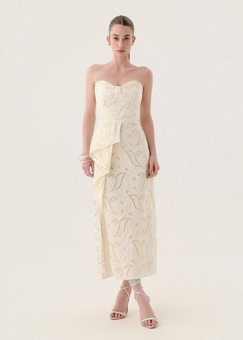 Em tom off white, o vestido midi bordado ganha uma aura clássica e atemporal. O busto estruturado com pregas e barbatanas embutidas valoriza a silhueta, enquanto o jabô lateral cria fluidez e delicadeza. A fenda lateral dá um toque de sensualidade elegante, tornando-o perfeito para celebrações sofisticadas. O fechamento em zíper invisível nas costas reforça o acabamento minimalista e sofisticado da peça.