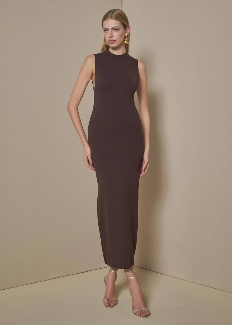 No tom Choco, o vestido mídi em tricot ganha uma atmosfera elegante e acolhedora. A textura do tricot, combinada à modelagem justa e à gola alta, cria um visual equilibrado entre conforto e presença. A cor quente e neutra permite criações infinitas de styling, indo do clássico ao fashion sem esforço. Finalizado com metal personalizado, o modelo eleva o minimalismo ao nível premium característico da LORE.
