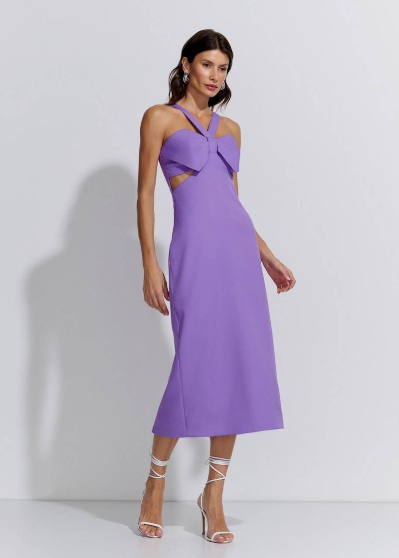 Delicado e ao mesmo tempo impactante, o vestido mídi lilás une feminilidade e informação de moda em uma única peça. Com decote que simula um laço e recorte vazado na frente, ele traz charme extra ao visual. Os recortes estruturam a silhueta, enquanto o crepe fluido garante elegância. Uma escolha perfeita para eventos especiais durante o dia ou à noite.