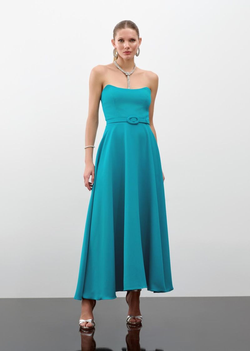 Moderno e sofisticado, esse vestido mídi godê em crepe destaca-se pelo decote em pontas, que traz um toque contemporâneo ao design clássico. Os elásticos traseiros garantem conforto e ajuste perfeito, enquanto o zíper invisível oferece um acabamento limpo. O cinto exclusivo ajusta a cintura, realçando a silhueta com delicadeza. No tom laguna blue, ele ganha frescor e leveza, ideal para eventos ao ar livre. Combine com sandálias de salto e acessórios delicados para um look romântico e atual.