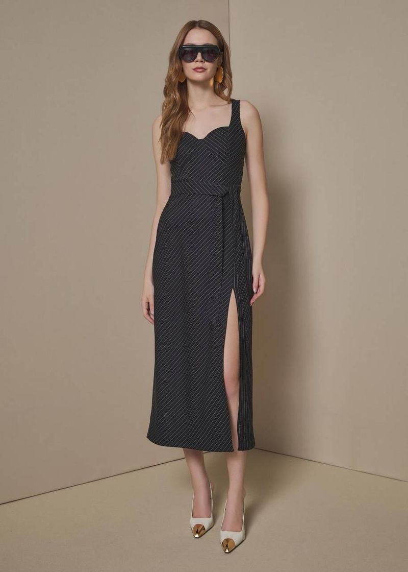 O vestido midi risca de giz preto é a expressão máxima do estilo clássico com um toque contemporâneo. A modelagem ajustada e a fenda lateral criam uma silhueta elegante e alongada, enquanto o decote coração adiciona feminilidade na medida certa. Um ícone de elegância atemporal, ideal para composições noturnas e ocasiões que pedem presença e sofisticação.