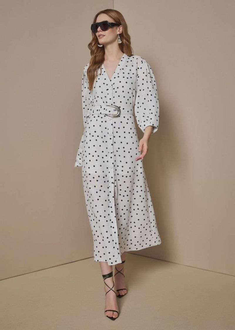 O vestido midi Off White combina sofisticação e leveza em uma estampa que ilumina o visual. As mangas 3/4 com pregas no punho e a fileira de botões forrados na patte reforçam o cuidado artesanal da peça, enquanto o cinto com fivela de metal marca a cintura com elegância. O caimento fluido e o design clássico traduzem uma feminilidade natural e atemporal, perfeita para ocasiões em que o estilo fala por si com sutileza e charme.