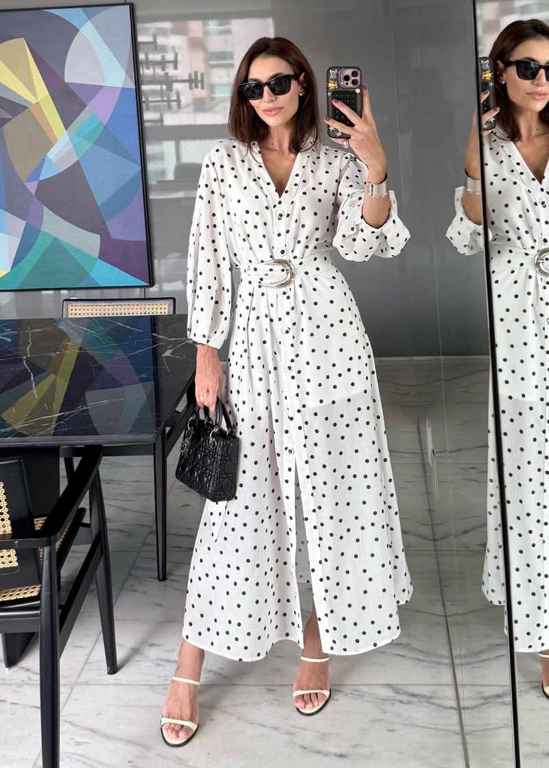 RoupasNew InEm AltaAKROVestidosVestidos LongosVestido Midi Estampado Com Cinto - Off White