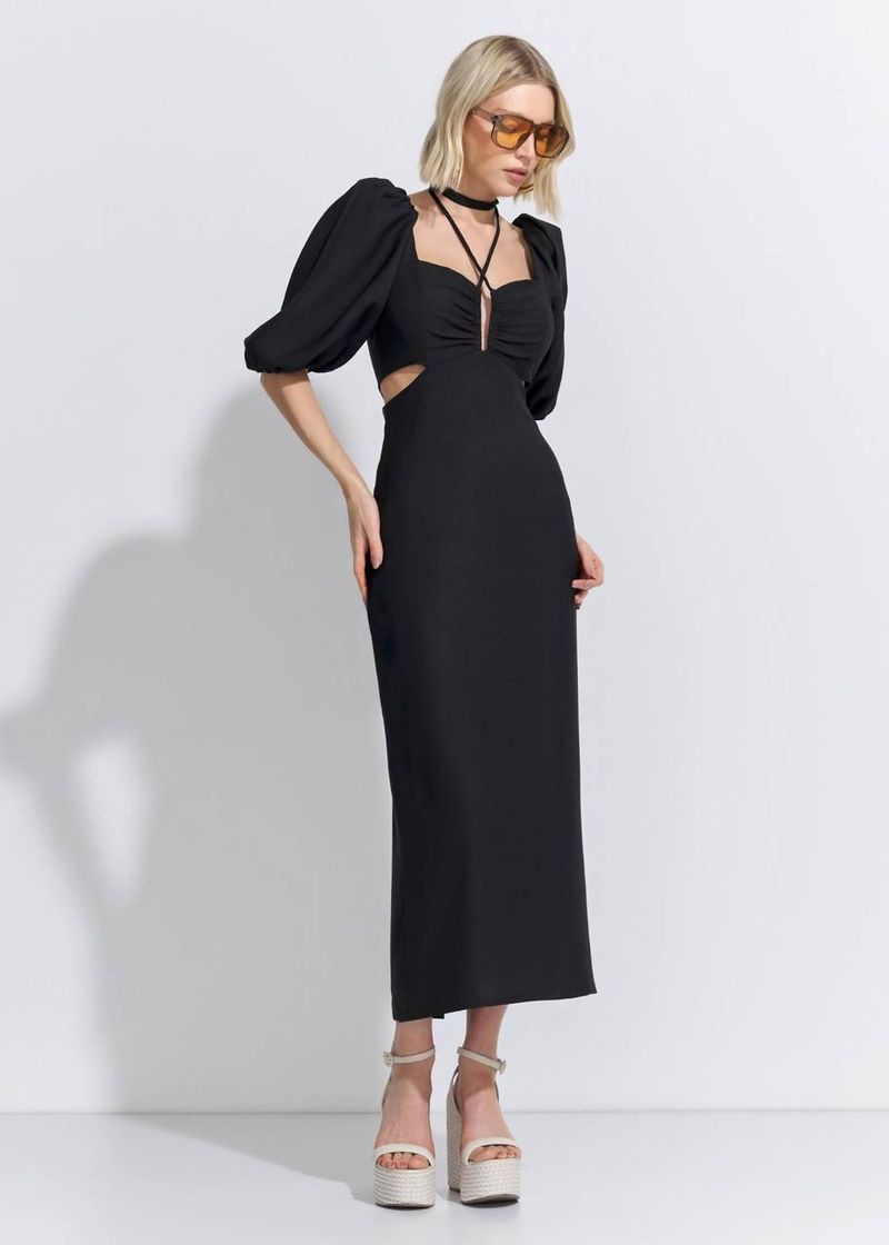 Nada mais atemporal e poderoso do que um vestido preto reinventado. A modelagem mídi com mangas bufantes e recortes laterais faz deste modelo uma peça essencial para looks sofisticados com personalidade. O decote estruturado em metal valoriza o colo, enquanto o preto garante versatilidade máxima. Aposte em scarpins ou sandálias de salto alto para jantares e eventos noturnos.