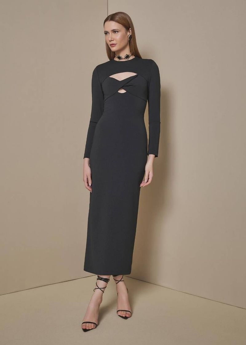 RoupasNew InAKROVestidosVestidos LongosVestido Midi Manga Comprida Com Decote - Preto