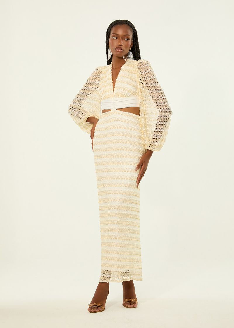 Vestido Midi Manga Longa Crochet Golden - Off White