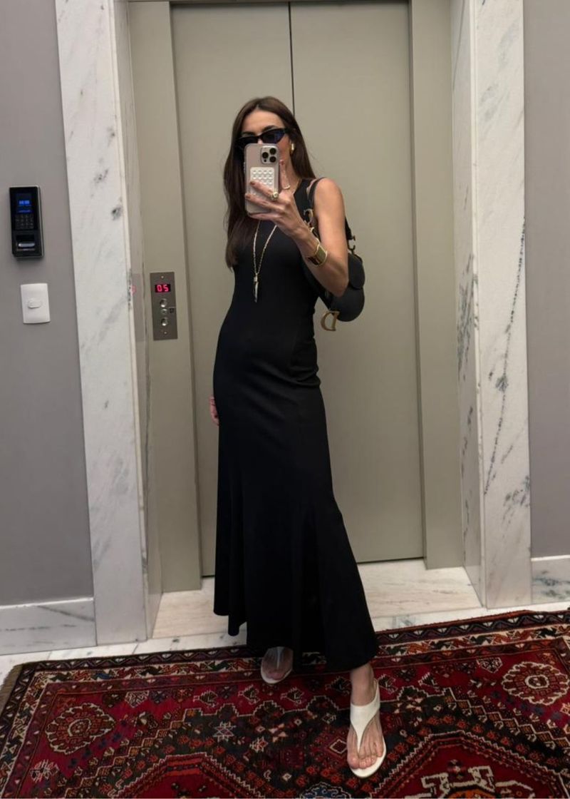 O vestido preto em malha ribana é aquele clássico atemporal com um toque moderno que toda mulher precisa ter. A modelagem valoriza as curvas com elegância, graças aos recortes estratégicos e ao caimento impecável. O fechamento com botão bombê nas costas é um detalhe discreto, mas cheio de charme. Use com sandália de tiras finas ou bota de salto para um look versátil, que vai do jantar ao evento mais sofisticado.