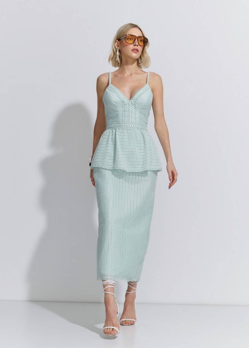 O vestido mídi em renda na cor acqua é a escolha perfeita para um visual romântico com personalidade. O decote com acabamento em renda e o detalhe peplum criam uma silhueta sofisticada e feminina, enquanto as barras também rendadas adicionam charme ao movimento da peça. O zíper invisível garante acabamento impecável. Combine com sandálias nude ou douradas para destacar ainda mais o tom suave e elegante do look.