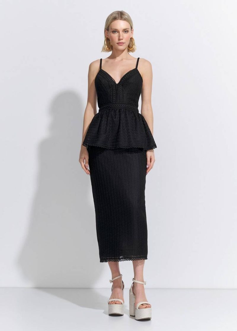 Elegante e poderoso, o vestido mídi em renda preta é um clássico com toque moderno. O detalhe peplum valoriza a silhueta, enquanto o decote adornado em renda traz delicadeza e sofisticação. A renda também aparece nas barras, criando um visual refinado do início ao fim. Com zíper invisível nas costas, garante caimento impecável. Use com sandálias de tiras finas e clutch metálica para um look noite marcante.