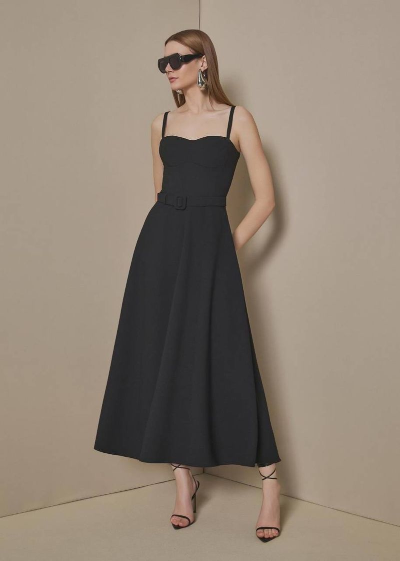 Em preto, o vestido midi é a expressão máxima do clássico. O busto estruturado com recortes e o cinto delicado marcam a silhueta com elegância, enquanto o comprimento midi e o caimento fluido garantem um visual sofisticado e versátil. Uma peça curinga para jantares, coquetéis ou ocasiões especiais.