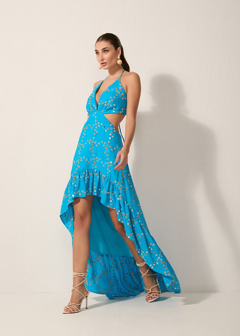 Vestido mullet em viscose bordada azul, com amarração para ajuste personalizado e zíper invisível nas costas para um acabamento elegante. Para eventos formais, combine com saltos altos, brincos statement e uma clutch delicada. Para um look descontraído, use com sandálias confortáveis, pulseiras em camadas e uma bolsa de palha. Versátil e sofisticado, garante estilo em qualquer ocasião.